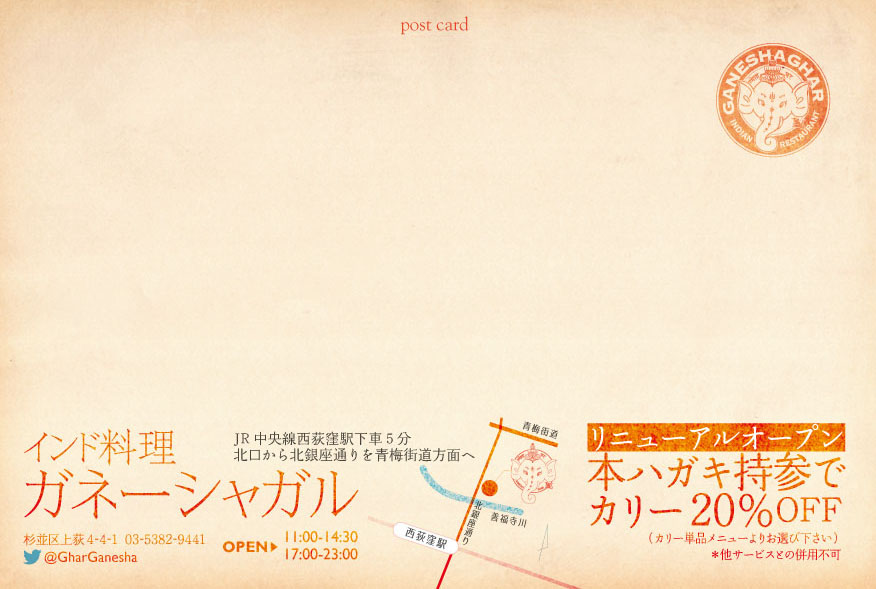 ポストカードはカリー割引券にもなっていて、ポスティングで周辺のおうちに入れていくそうです。割引利用後も持ち帰ることができるようにするって言ってましたので、じゃんじゃん使って下さいませ〜