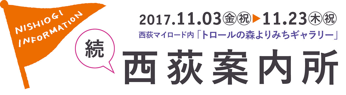 続・西荻案内所は、11月3日(金祝)から23日(木祝)まで、西荻マイロード(高架下ステーション街)の中にある「トロールの森よりみちギャラリー」にてオープン。ほかに、佐藤ひろみさんやサム・ストッカーさんの「トロールの森」出展作品や、0円均一企画「0円は三文の得!?」なども実施しています。