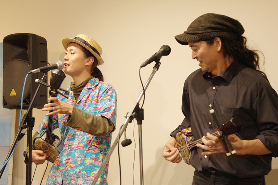 夜の沖縄ライブは、会場に見に来ていた松尾慎吾さんが飛び入りで参加。デュオでの三線は迫力満点。濃度の高い会となりました。