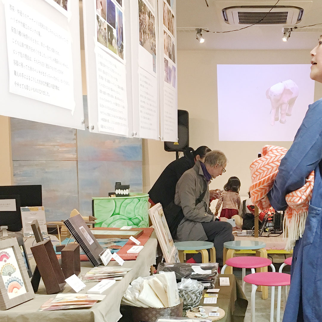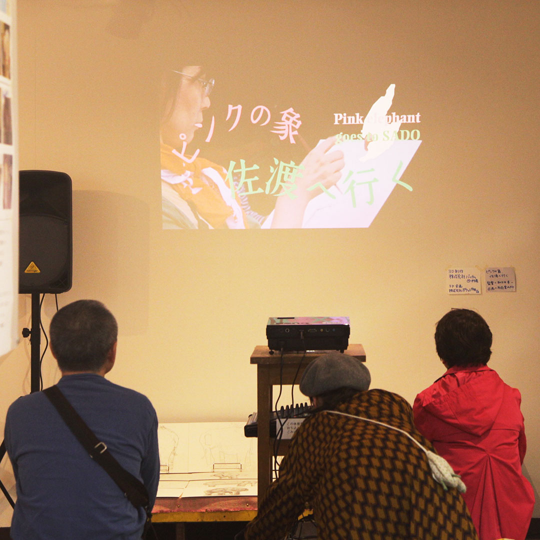 映像の間の時間は、映像で使っていた西尾賢さんの曲「ビシと」「ほやの夢」「アマドコロ摘んだ春」のほか、「佐渡おけさ」「佐渡ハンヤ節」を流しつつ、株式会社バッカムの黒川さんと株式会社ポケットの堀内さんにつくってもらった「ピンクの象3D」で遊べるようにセッティング。こどもも大人も、ぐりぐり動かしてはしゃいでいました。