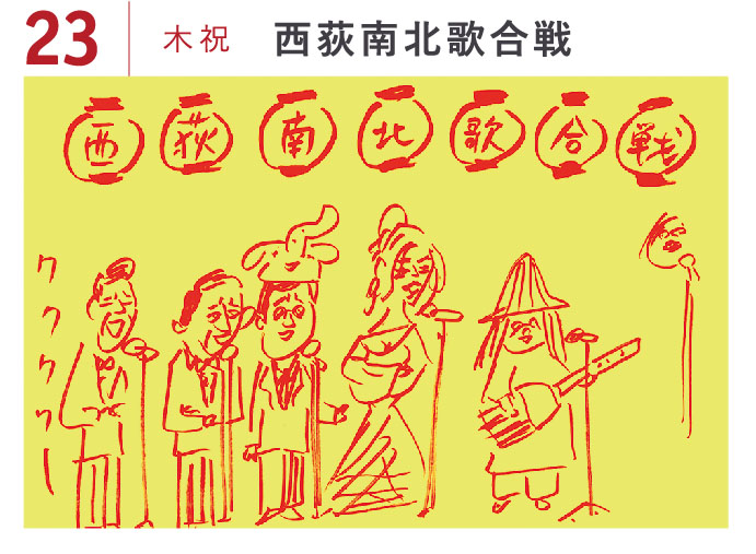 続・西荻案内所の大トリは、「西荻南北歌合戦」。中央線の南と北でチーム分けして、歌自慢が競います。しかも会場「続・西荻案内所(トロールの森よりみちギャラリー)」は中央線の高架下。南と北のどちらでもない場所ですから、本企画にとって、これ以上ない立地!