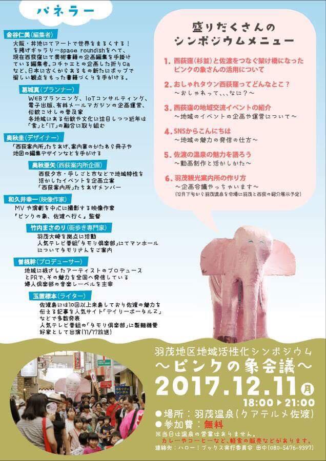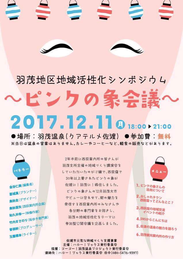 羽茂地区地域活性化シンポジウムということで、羽茂温泉(アルカリ性で肌がつるつるになるめっちゃいい湯です)の畳の広間をつかって、西荻案内所ほか、映像作家の和久井幸一さん、プランナーの葛城真さん、編集者の金谷仁美さんなど西荻から5人が行き、そこに婦人倶楽部(佐渡の覆面アイドル)プロデュースの曽根幹さん、そしてタモリ倶楽部出演者が2人(マンホーラーの竹内さんと製麺機愛好家の玉置さん)加わり、佐渡のみなさんと、ピンクの象のこれからについて話し合います。