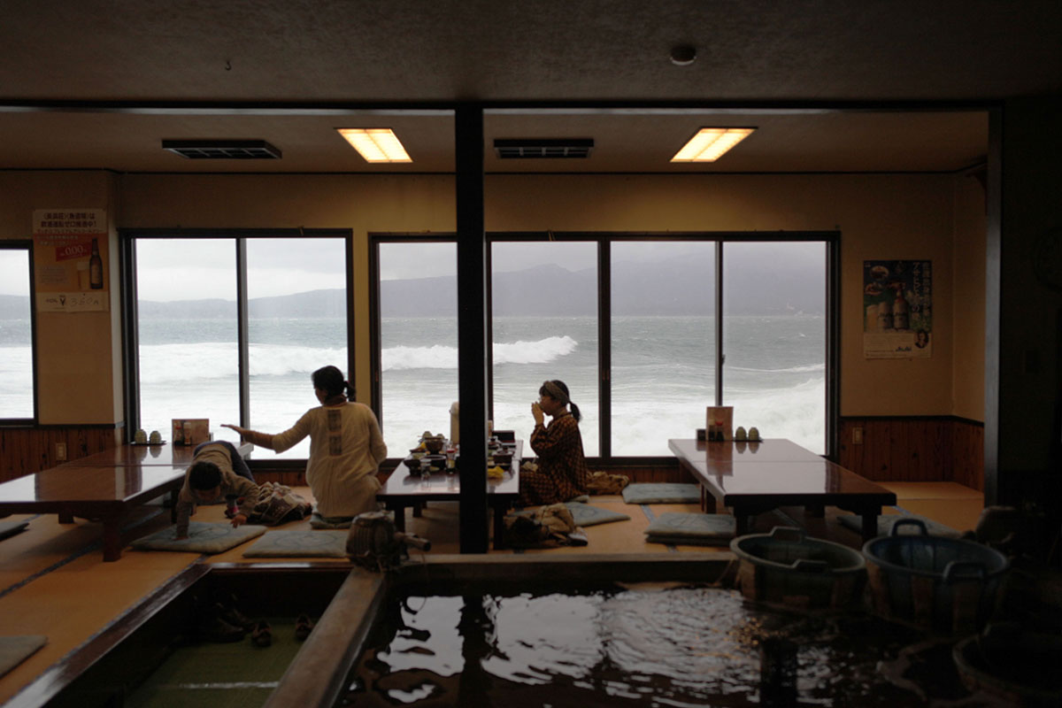 今季最大の寒波がやってきて海は大荒れ。外には現実感のない絶景がどーんとひろがります。雨雪をよけて海鮮丼でほっと一息。