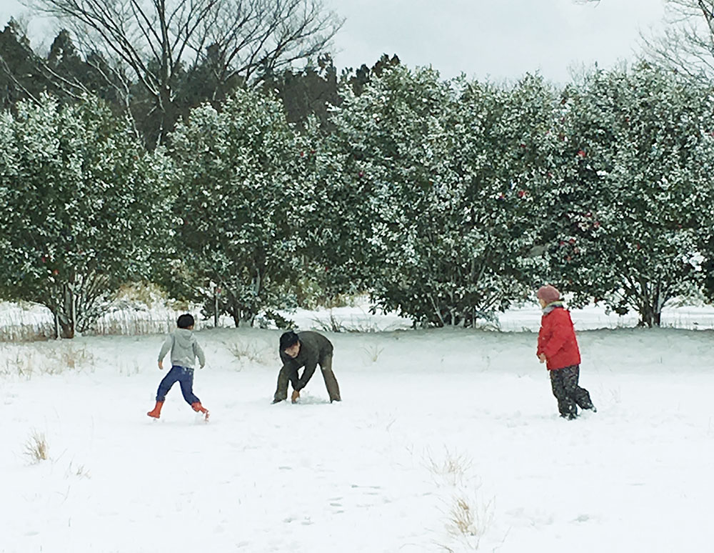 さて翌12日は東京に戻る日。宿泊しているふすべ村の窓をあけると一面の雪でした。はしゃぐ子どもたち。大人は一人ずつ外に出て、雪玉の的になります。