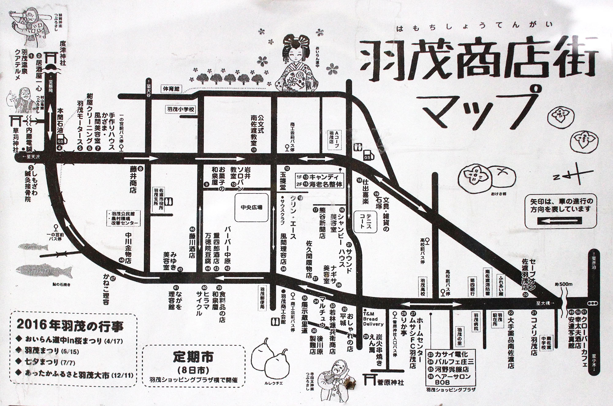 また、年間を通していろいろなイベントがあります。4月のおいらん道中、12月の羽茂大市など。特に有名なのは6月の羽茂まつり。中心となる羽茂本郷にある草刈神社と菅原神社のお祭りで、みうらじゅんさんが『とんまつりJAPAN』という本でも紹介したした奇祭「つぶろさし」が特に有名。また当日には、草刈神社の歴史ある能舞台では、地域の人による奉納薪能もあります。