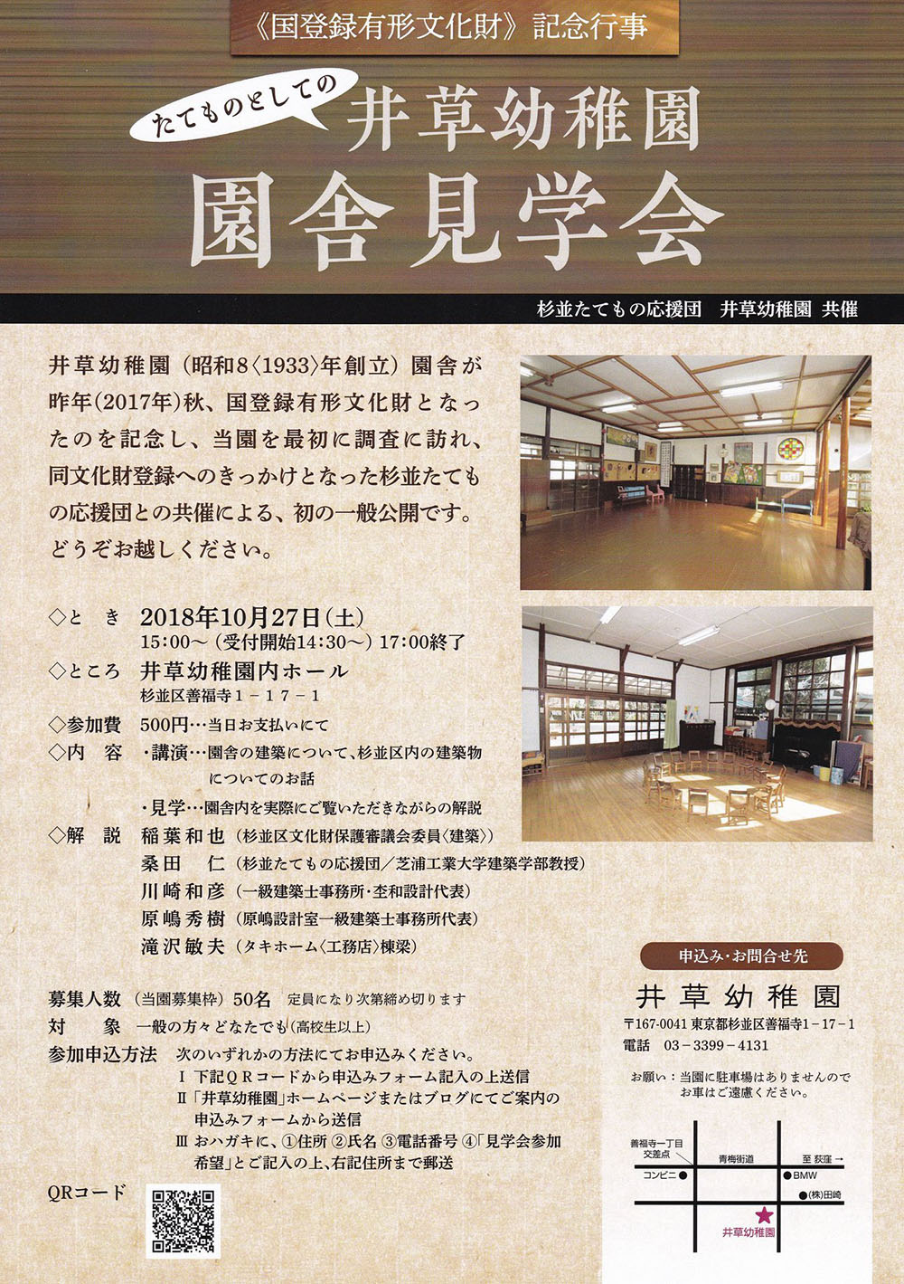 井草幼稚園のホールなど、意匠がとてもかわいいという話は聞いているのですが、幼稚園だけになかなか入る機会がありません。専門家の解説もつきます。興味のある方は、ぜひお申込みを。