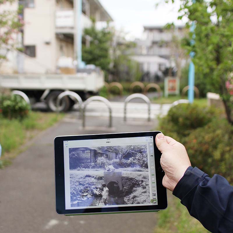 井草川の昔写真といえばこれ、と野田さんが出してきたのが、タブレットに映し出されている写真。子どもたちが井草川で遊んでいます。野田さんは今回、この写真の撮影位置を特定したと発表。その場所がこちら。おしゃれにぼかしたのが逆に大失敗しているのですが、左のぼやけたアパートがその名も「リバーサイド」。まさに川の痕跡です。井草川暗渠の(マニアックな)見どころのひとつ。