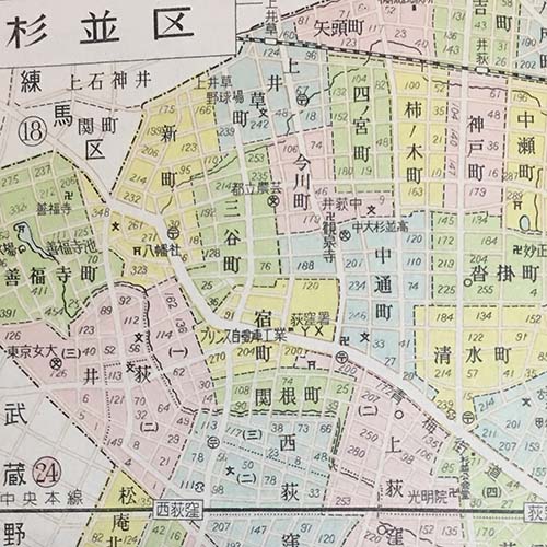 というわけで、ややエリアを離れて2つの井荻が誕生してしまったというわけ。井荻1〜3丁目はその後、1964(昭和39年)に消滅。小学校や井荻會館にその名を留めるのみとなり、現在、「井荻」といえば、西武新宿線の井荻駅とその周辺のことを指し、西荻北一帯のことだと思う人は稀でしょう。(地図は井荻消滅直前の1963年のもの)