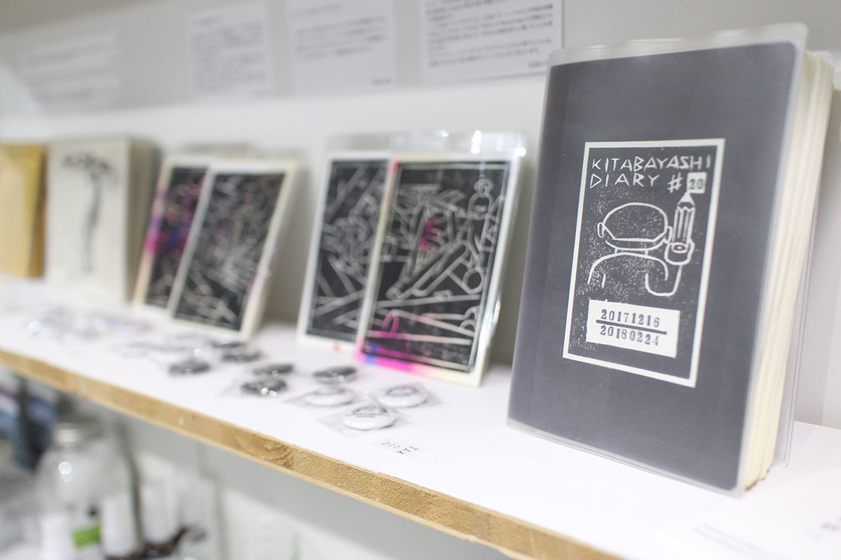 さて、Miesさんでの展示、全体としてはコンパクトですが、さり気なく置いてある手帳(下写真右)は必見。ウェブ上でも見られる日々の絵日記の原画です。北林さんの線、実際に描かれたものを見ると、その繊細さにどきっとします。日常が描かれながら、ここ数ヶ月の北林さんはなかなかにドラマチック。お時間ある方はぜひ手にとってみてください。