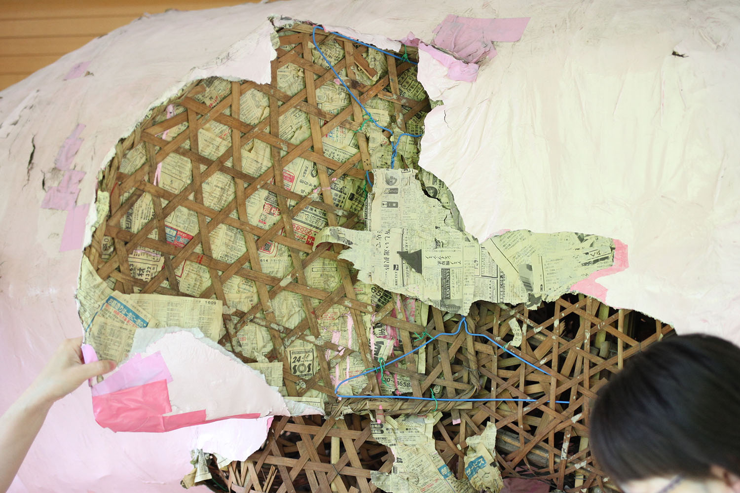 正直、大丈夫だろうかという不安はありました。見た目それなりにぼろぼろだし、表面の張力でなんとか形を維持しているだけで、もしかしたら紙をはがしたとたんにバラバラと崩壊しちゃうかもしれない。針金や竹素材がビョーンと飛び出してきたりとかもあるかもしれない。