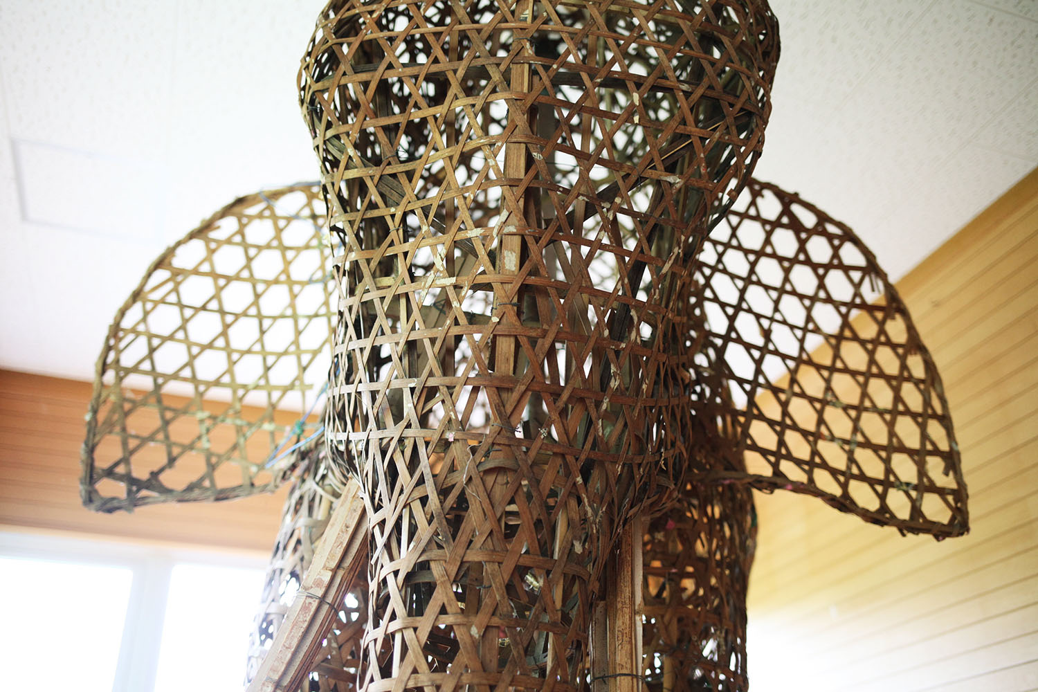 頭の方から内部を覗き込みます。角材が入っているという話でしたが、芯材は細身の竹で、角材が入っているのは釣り手のある背骨の部分だけでした。おしりのほうは円形の編み方になっていて大変美しいです。それが脚の方に至るフォルムのなめらかさ。最初にどこからつくっていったのか、素人にはさっぱりわかりません。