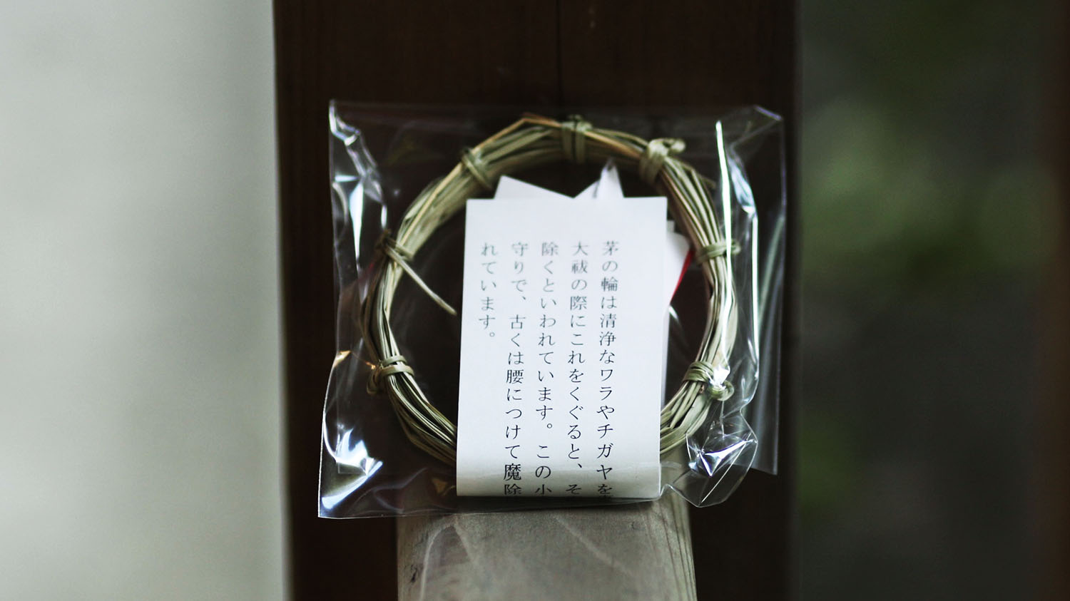 井草八幡宮の大祓には茅の輪くぐりはありません。そのかわり儀式の最後、参列者に小さな茅の輪を配布してくださいます。除災招福のお守りです。家に帰り袋をあけると、茅の草のいいにおいがしました。