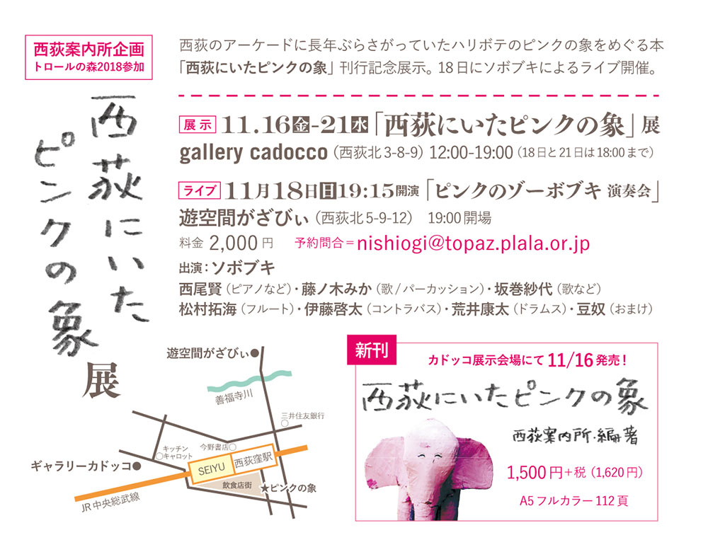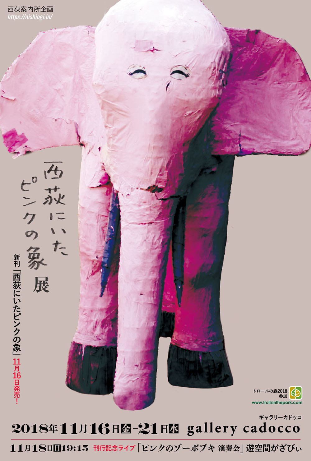 発売開始に合わせて、「西荻にいたピンクの象」展をgallery cadocco(西荻北3-8-9)にて開催します(トロールの森2018参加)。