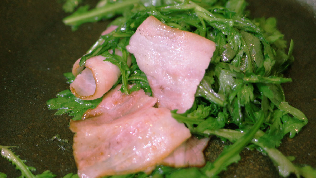 油を使わず、ベーコンから出る油で炒めあわせて……
