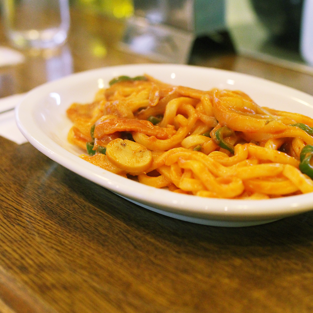 写真は、ラジオの収録後に村田商會で食べたナポリタンうどん。