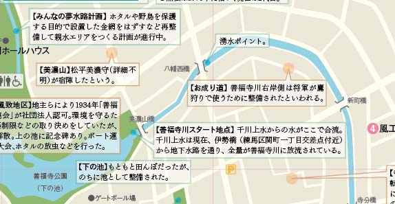 あと、善福寺池周辺のあれこれ。原寺分湧水以外の湧水ポイント、千川上水のからの地下水路の合流地点、それから、「みんなの夢水路」計画です。