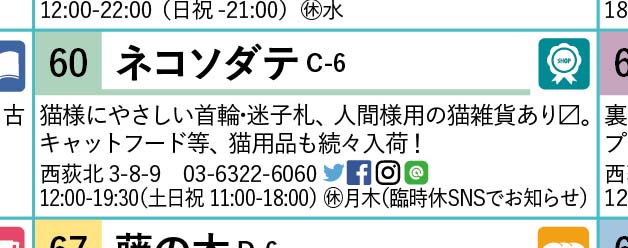 裏面はお店情報になっています。今回からは各店のSNS情報を追加。Twitter、Facebook、Instagram、Line@の4種類です。掲載196店中、この4つのSNSをすべてやっているお店が1軒だけありました。60番ネコソダテさん。昨年オープンした猫用品のお店です。