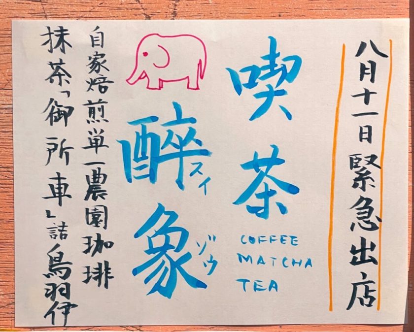 こんにちは、西荻のことカフェ運営メンバーの西荻案内所です。2025年8月11日(月祝)ですが、いつもの月曜出店者がお盆休み。そのため、ドリンク部門を急遽担当します。一昨年のクリスマスイブ以来、1年半ぶりの「喫茶醉象」です。