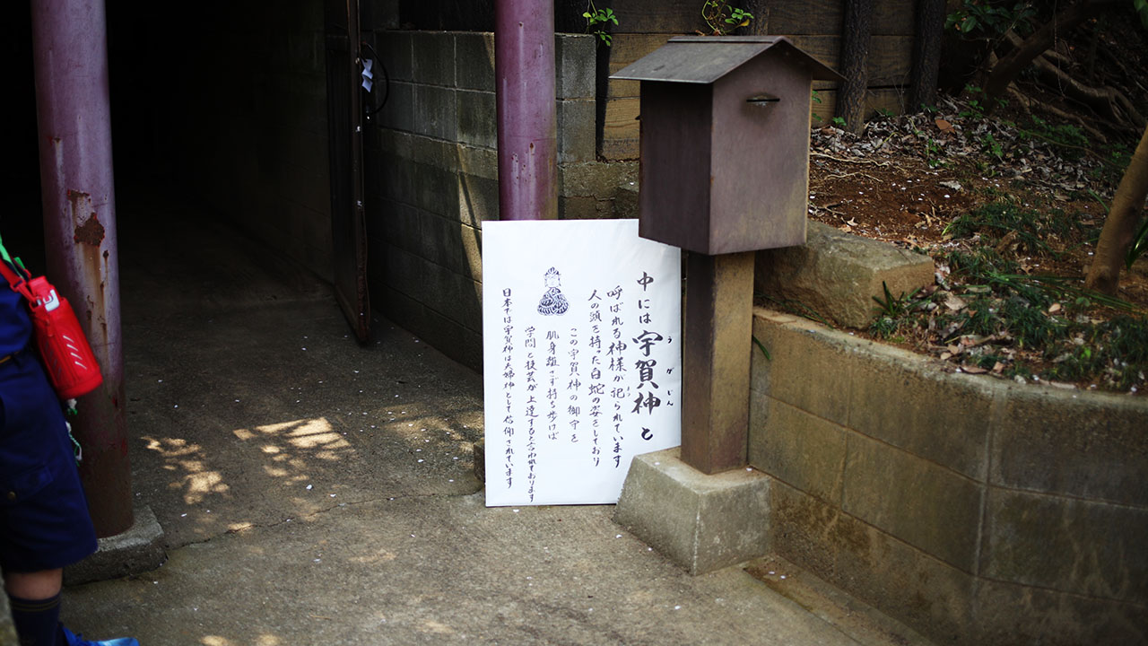 おや、入り口に立て看板。宇賀神とは人頭蛇身で、出自不明の日本古来の神様。弁天様とセットであるいは同一のものとして祀られ、「宇賀弁才天」として信仰されてきました。この穴の中には、池底で見つかったと言われる宇賀神像があるのです。では中へ参りましょう。