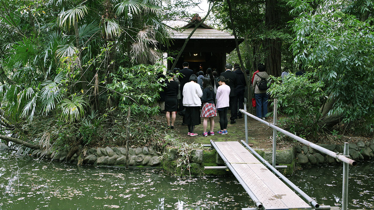 ふだんは閉められているお堂が開いています。仮橋を渡り、弁天島へ。