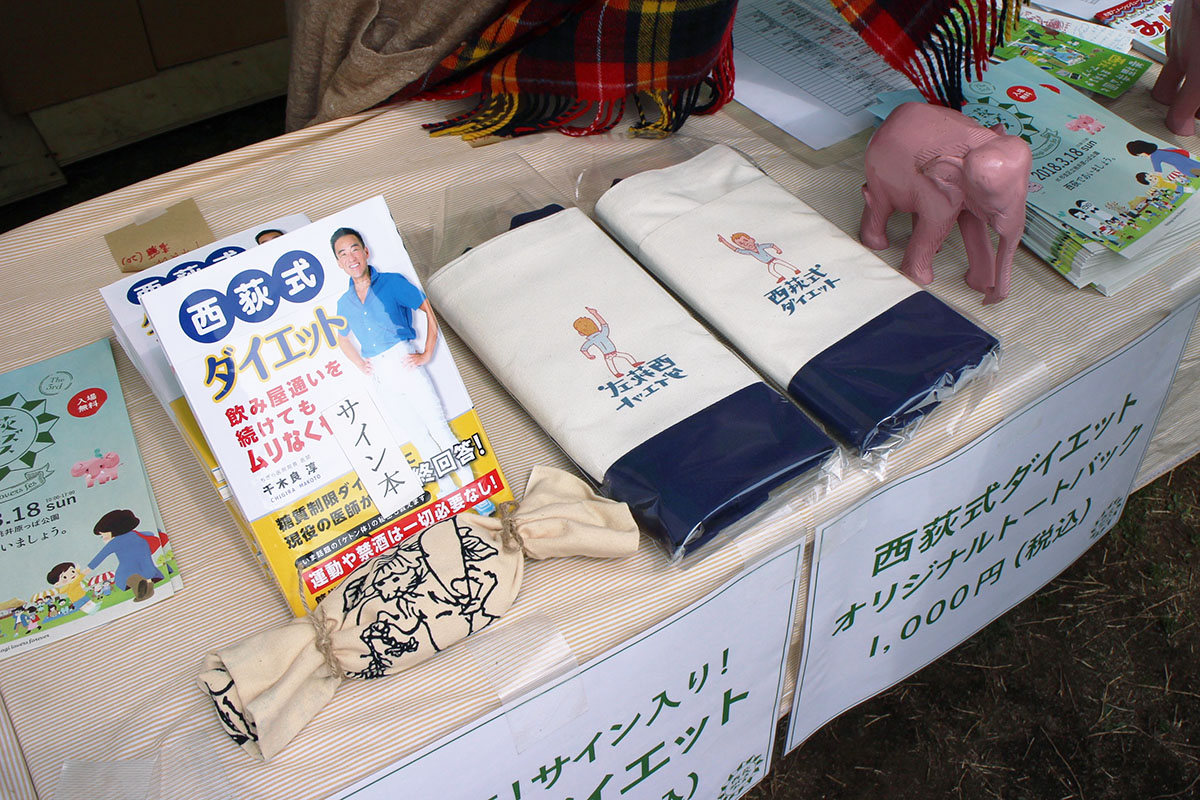 フェス会場で緊急時に備えて待機していたのはおなじみ、ちぎら医院の千木良淳先生。前回・前々回のフェスでは西荻案内所編集の小冊子として販売していた「西荻式ダイエット」、昨年はついに徳間書店から単行本になっています。フェス本部ブースでは西荻式ダイエットのサイン本と、オリジナルのトートバッグを販売。トートバッグの方は小冊子版の鈴木勇介さんイラスト(「サタデー・ナイト・フィーバー」)と、ワタクシがつくったタイトルロゴが採用されてました。