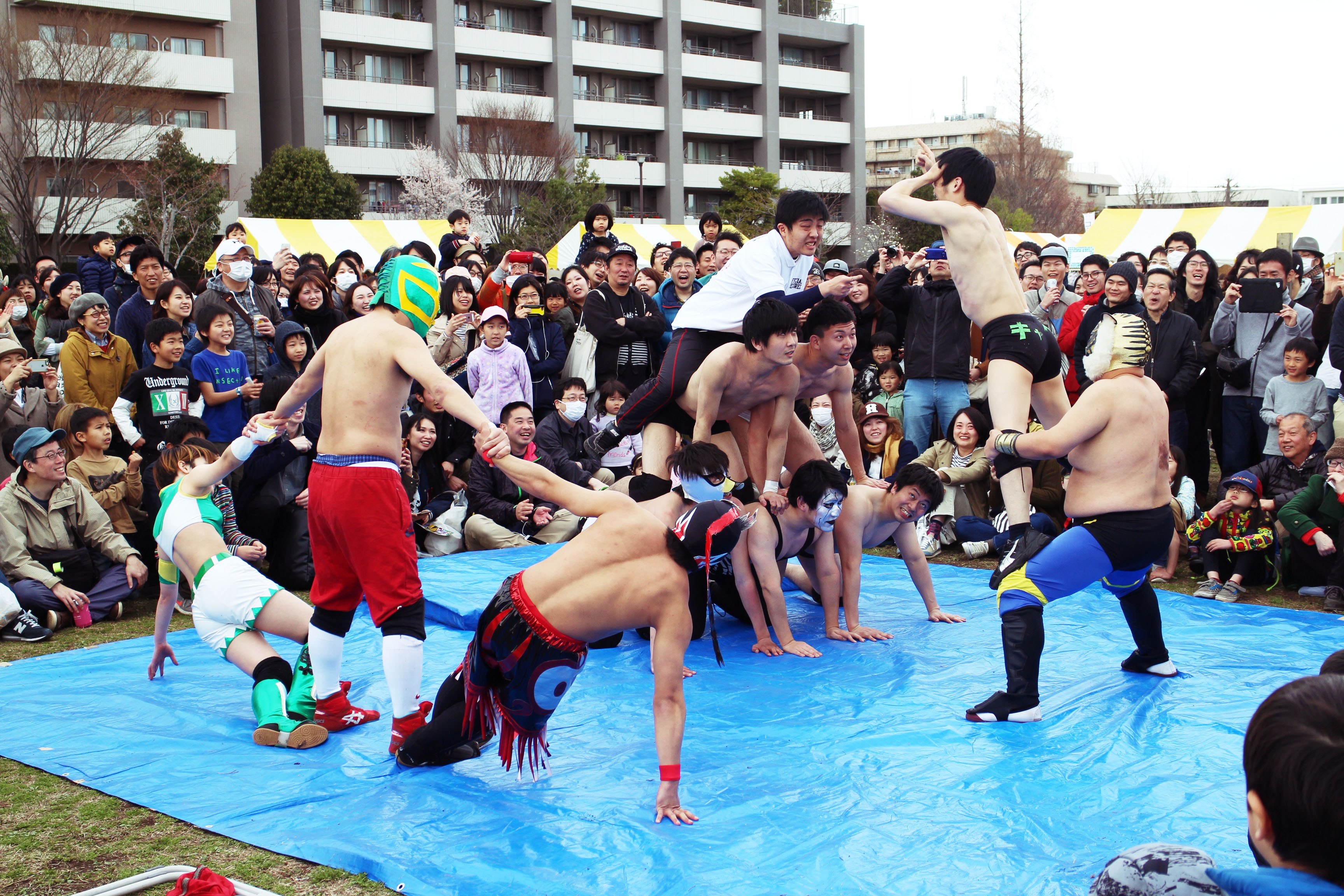 そして西荻ラバーズフェスで生まれた西荻おざしきプロレスが再び、聖地・桃井原っぱ公園に帰ってきました。おざプロのみなさんには昨年11月の続・西荻案内所でもお世話になりましたが、やっぱり野外は迫力が違いますね。みなさんのびのびと組体操の図。