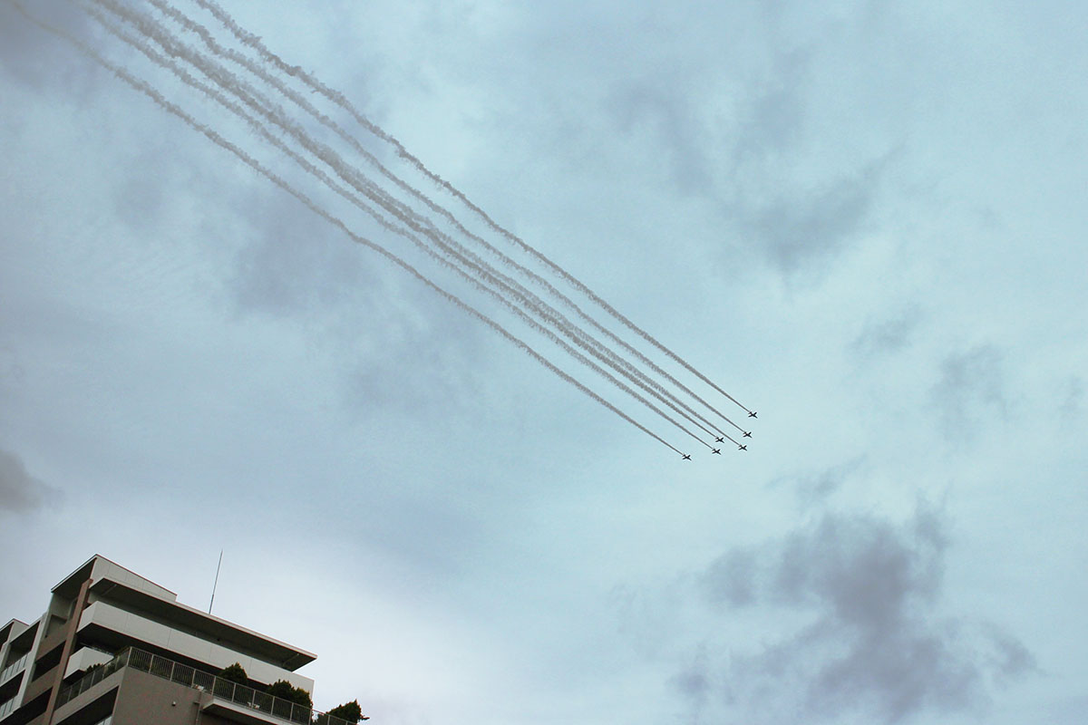 そうそう、会場上空をブルーインパルスが飛んでったのにはびっくりしました。西荻ごときのフェスでまさかブルーインパルス!? どんな政治力が働いたんだと憶測を呼びましたが(笑)、もちろん西荻ラバーズフェスのために飛んだわけはなく、横須賀にある防衛大学校卒業式でのイベント飛行の帰投ルートになっていたようです。