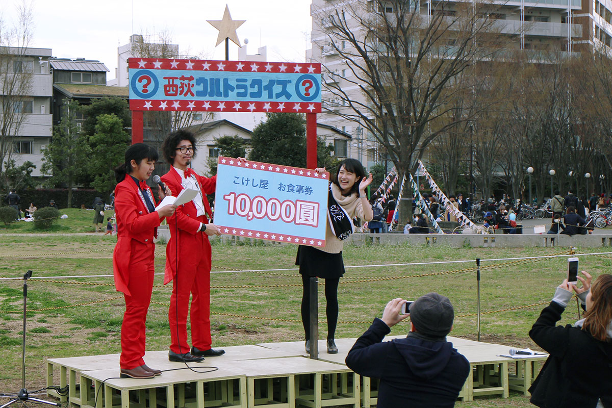 フェスコンテンツの西荻ウルトラクイズ。これ、ワタシが参加したらもしかして優勝しちゃうかもなって思って観客として楽しんだのですが、難題揃いで運も左右する内容、参加してもたぶん途中でダメだったろうな。優勝賞品はこけし屋の食事券と実利のあるもの。旧車のハコスカ(会場の桃井原っぱ公園は元日産工場)じゃなくてよかったですね〜。
