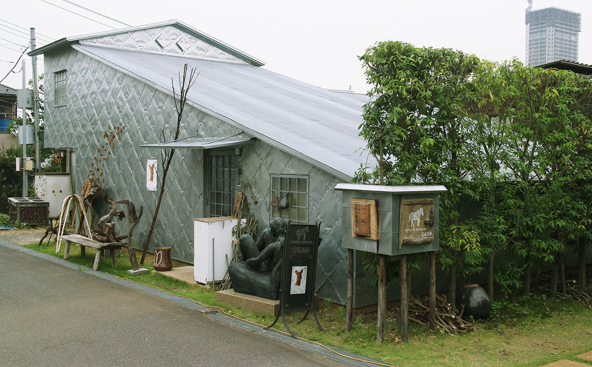 外壁はトタンでしょうか。パッチワーク状に金属を貼り合わせたテカリのある建物で、天候によっても時間帯によっても印象がぜんぜん違うのでしょうね。その外壁に飾られていたのは……。