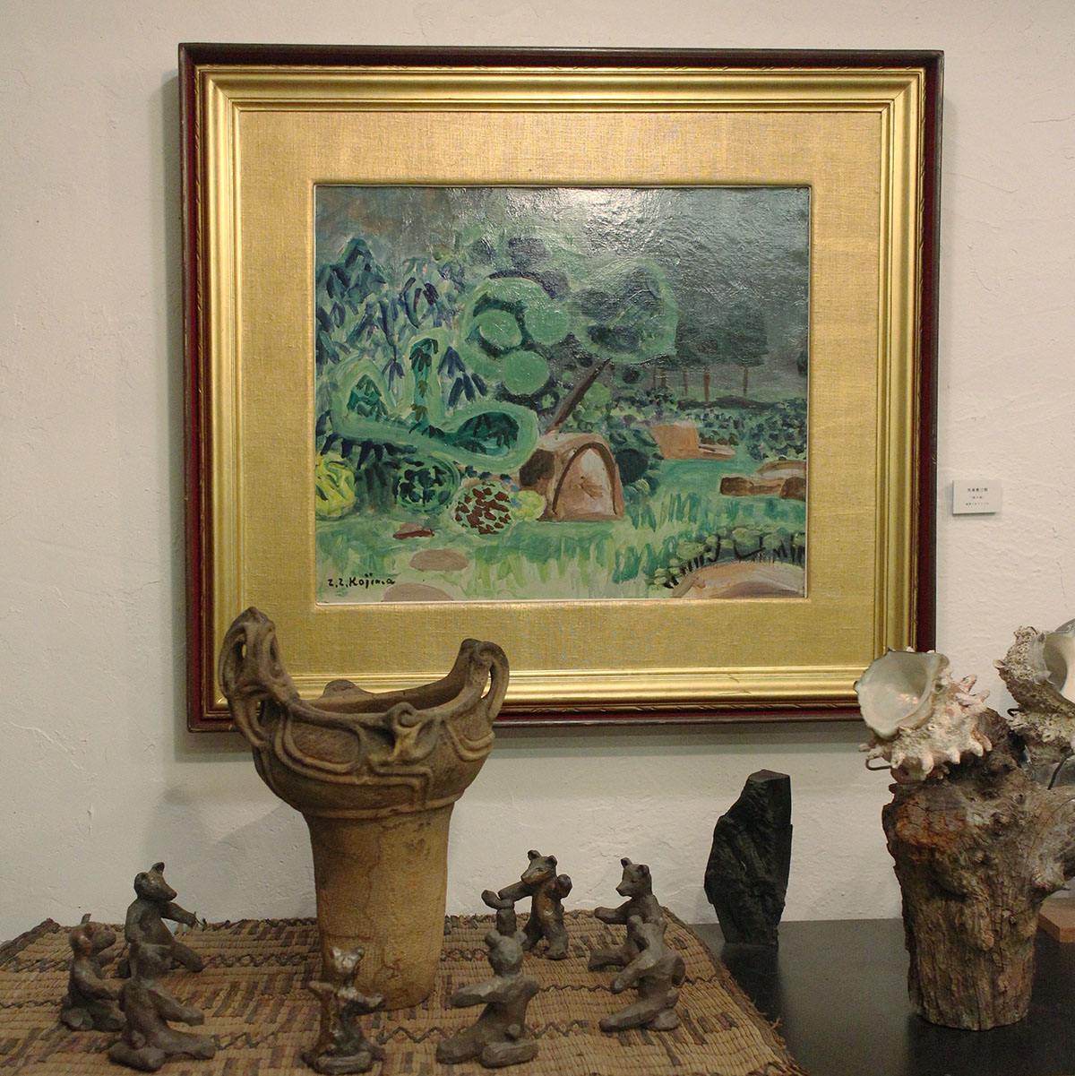 オーナーさん個人蔵の縄文土器と現代作家の作品が不思議に共存、しかもそこに児島善三郎の絵も入り込んできて、かなりの情報量!