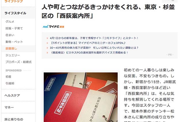 マイナビニュースで紹介されました nishiogi_info 11年前 「マイナビニュース」の記事で西荻案内所を紹介してもらいました。 チャンキーさんがインタビューに答えるというレアケース。 https://news.mynavi.jp/article/20150204-a124/