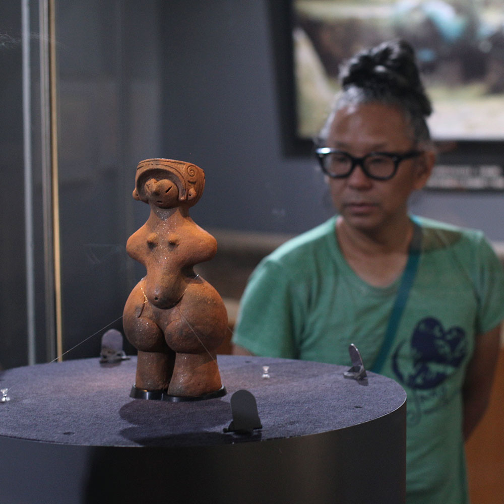井草八幡宮に収蔵されている縄文土器「顔面把手付釣手形土器」の奇妙な造形。どうやら祭祀の時に中に火を灯したものなのだそうです。