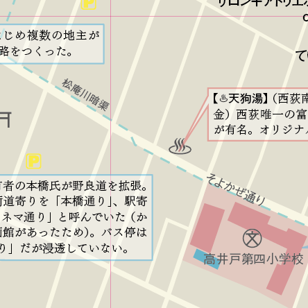 「松庵窪」は前回にも入ってましたが、「西荻暗渠探検」の成果をふまえて、少しボリュームをつけてみました。その下、「西高井戸児童遊園」のところに、旧地名「西高井戸」の解説を新たに入れています。西荻なのになんでここで高井戸なのよ、というところの解説になっています。このあたり杉並区になる前は「高井戸町」だったんですよね。