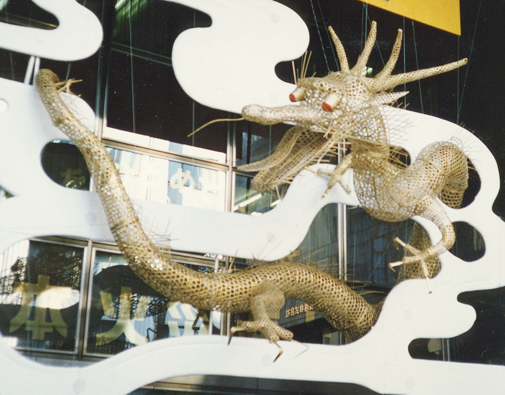高度経済成長期、竹製品がプラスチック製品に代替していく中で、一部の竹職人たちは、竹をつかった巨大造作物をつくることで生き残ってきました。大企業の正月飾りやイベントのシンボルなど、東京という街ならではの、巨大なエネルギーを象徴する造作物が、実は昔ながらの竹細工だったのです(写真は竹清堂さんよりお借りした保険会社本社に設置された正月飾りの写真。全長15メートルの大作)。