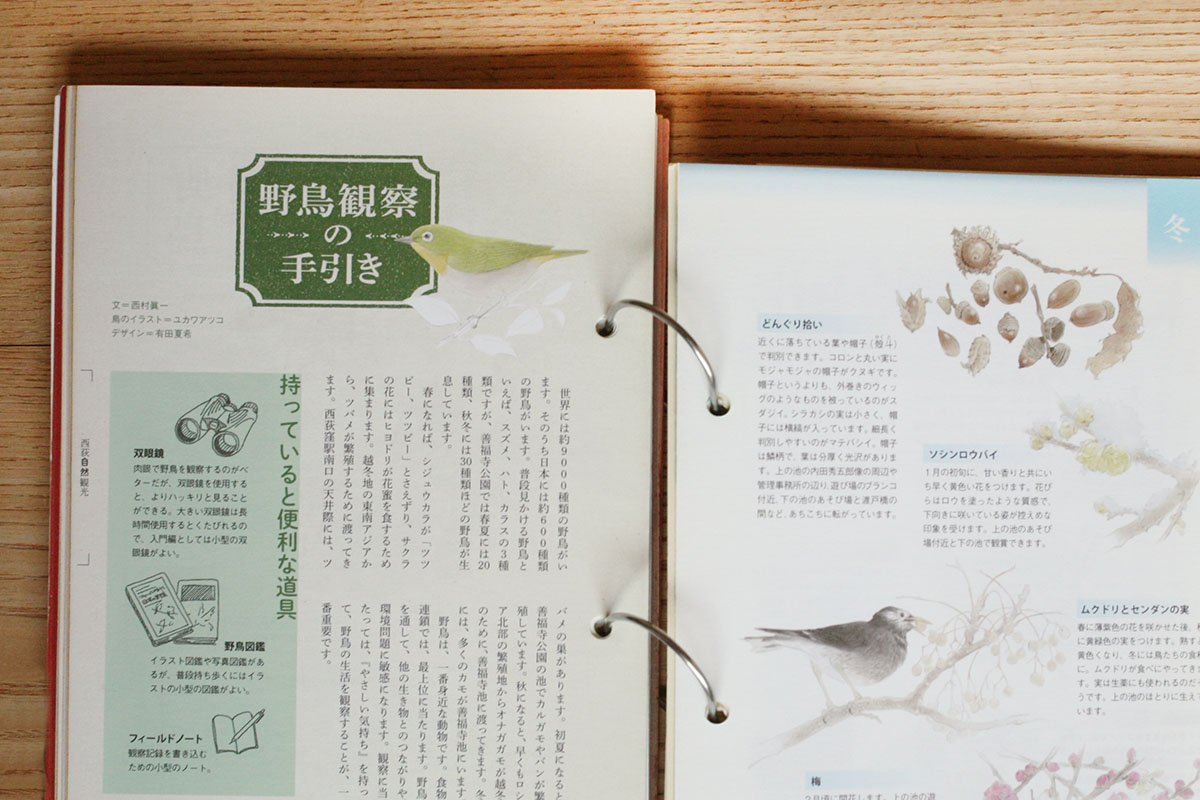 日本野鳥の会発祥の地といわれる善福寺公園。創設者の中西悟堂が近所に住んでいました。「西荻自然観光」は、善福寺公園で見られる30種の野鳥の野鳥図鑑、同じく公園で見られる四季折々の動植物、それから西荻の巨樹を紹介しています。野鳥図鑑は西荻北のFALLで個展をときどき開いているユカワアツコさんのイラストで、文は善福寺公園のギャラリーでときどき野鳥写真展を開催する写真家の西村眞一さん。
