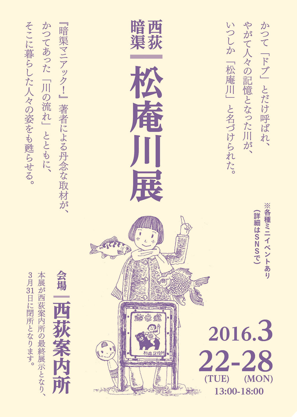 西荻ラバーズフェス後の西荻案内所は、3月22日より28日まで、『暗渠マニアック!』著者の吉村生さん、高山英男さんをお迎えし、最終展示「西荻暗渠 松庵川展」を開催します。いまから40年ほど前に暗渠化された名も無きドブ川に、市井の郷土史家により「松庵川」という名がつきました。松庵川の痕跡(橋桁や蓋など)は西荻南や宮前を中心に現在も残っていますが、正式な記録としては、そもそも川の扱いではなかったので大変に乏しいのが現状です。それを吉村さん、高山さんが、ドブの記憶を持つ近隣の方々などに取材して、丹念に拾い集めた成果を発表します。