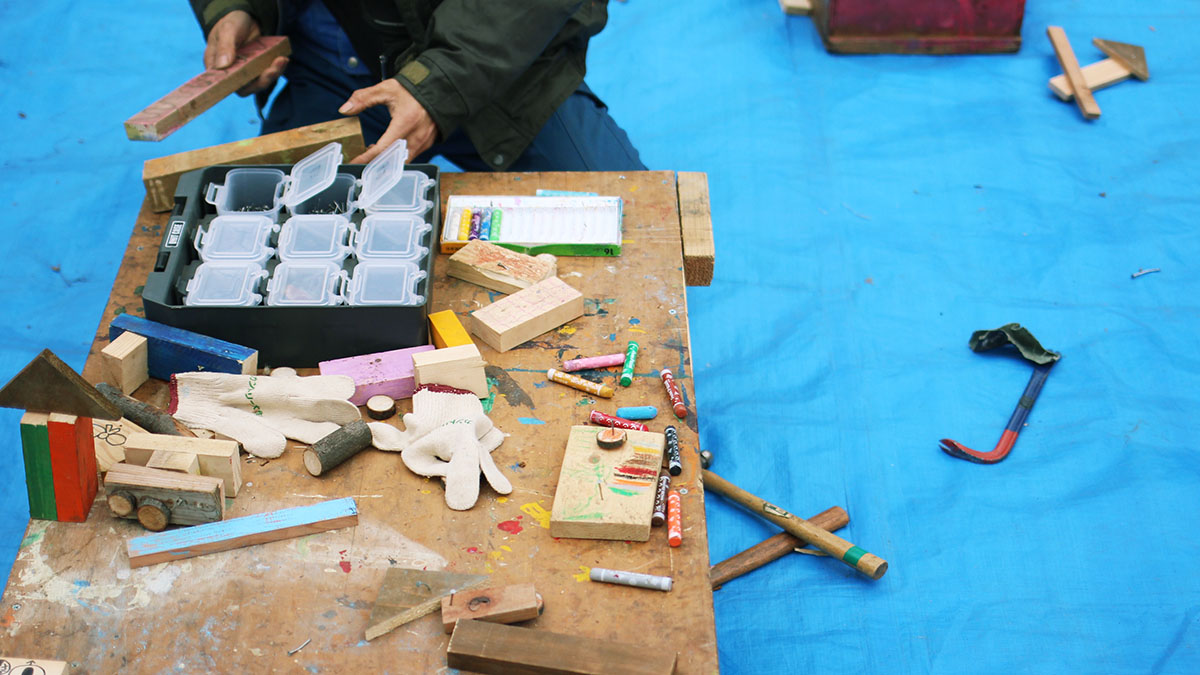 つまりどんなのがあるかというと、ロープワークでターザンとか、ハンモックとか、自然を使った遊び、木工作や昔遊びなどの手を使った遊びなど。公園にすでに設置されている遊具でだけ遊ぶのではなく、遊びを生みだすのがポイント。