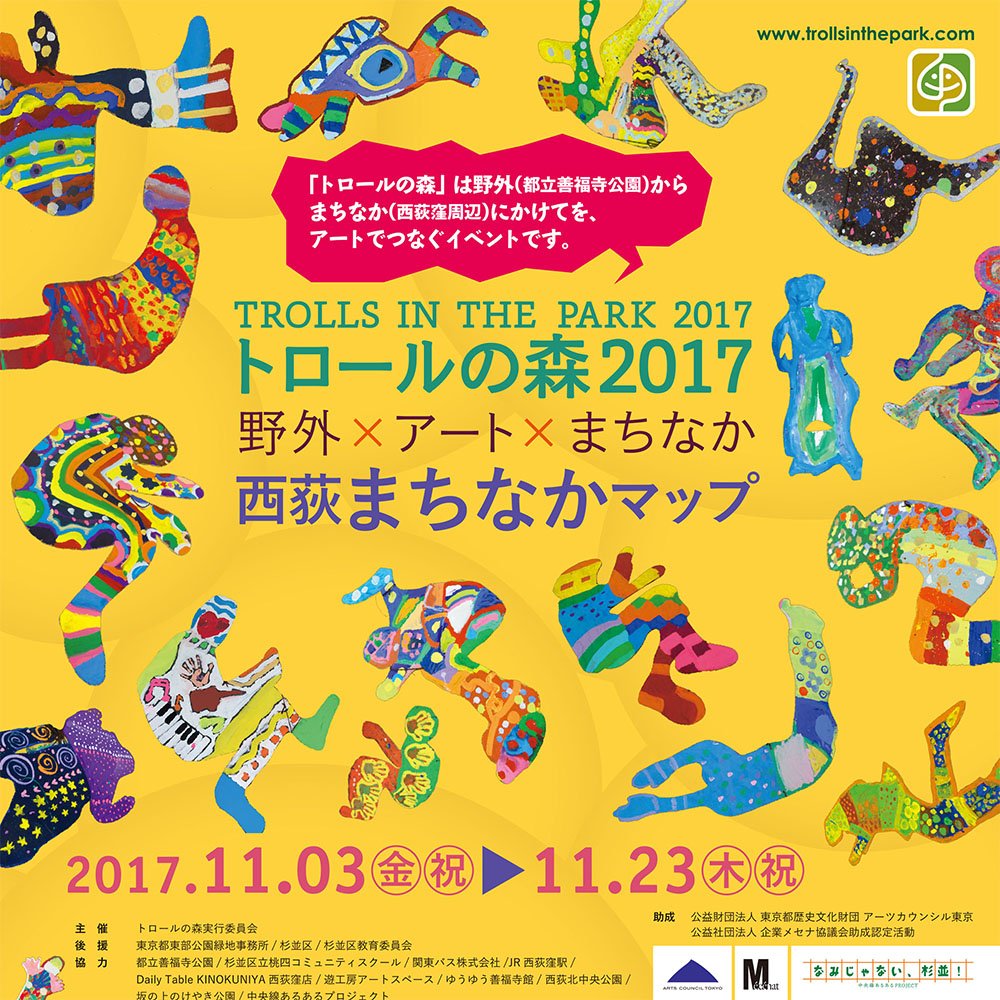 今回「続・西荻案内所」の開設にあたり、西荻に住まう/働く方々にお声がけしました。ピンクの象を佐渡に運ぶなどの重大ミッションもあって準備が遅れ(こちらの報告は近日中に出したいです)、すでにスタートまで半月となりましたが、ようやく全容が見えてきましたので発表します。それぞれ個性的なメンバーが揃い、もう今から楽しみです。以下画像は、近日配布開始の「トロールの森2017西荻まちなかマップ」より。日毎のコンテンツは追ってご紹介していきます。