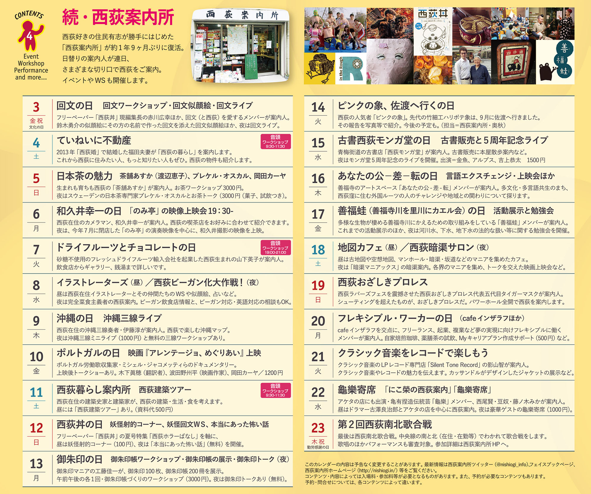 は2016年3月31日に閉じた、場所としての西荻案内所、その当時はできなかったことを今回は実現します。それは、このまちに住むいろんな方々が日替りで西荻案内をする、というもの。まちの見方は人それぞれ。西荻はサイズとしてはさほど大きなまちではありませんが、それでもわずかの人間ですべてを網羅できるわけがありません。掘れば掘るほどいくらでも話題が出てくるし、なにしろこのまちにある商店数は1000以上とも言われているのです。10人いれば10人の西荻がある。それは西荻案内所活動の3年間で痛感していたことです。